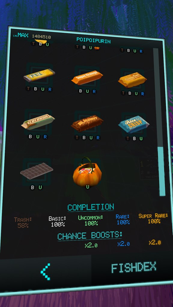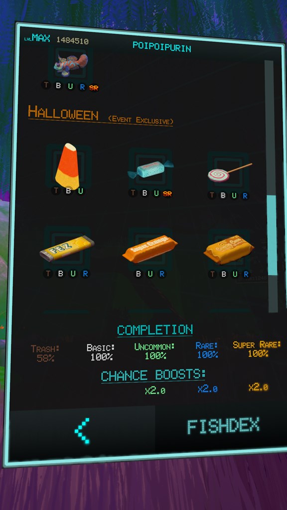 ・HALLOWEEN JOKER:次に釣れるSRの魚が1回だけまだ図鑑に登録されていないお菓子が釣れる